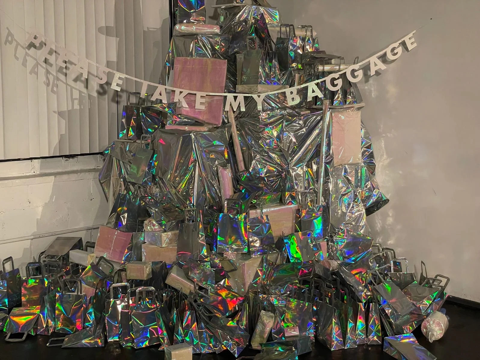 Please Take My Baggage, 2023, paper, glitter, glue, tape, invisible string, holographic bags, holographic cloths, iridescent wrapping, artist's objects and memories, freely given
